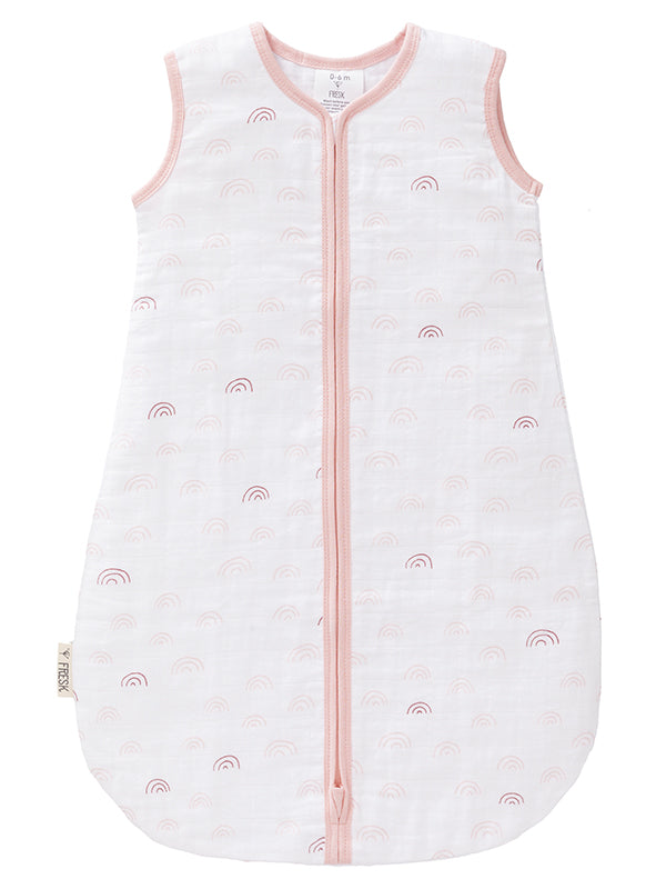 Sacul de dormit cu model curcubeu roz, de la Fresk, este realizat dintr-un dublu strat de muselina, material foarte respirabil. Este un sac potrivit pentru zile nu foarte friguroase, in special cele de vara, deoarece muselina este realizata din bumbac organic fin si subtire.